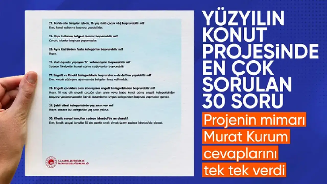 Çevre, Şehircilik ve İklim Değişikliği Bakanı Murat Kurum, 81 ilde 500 bin sosyal konutun inşa edileceği, "Yüzyılın Konut Projesi" ile ilgili merak edilen soruları ve yanıtlarını sosyal medya hesabından paylaştı. Bakan Kurum, "Yüzyılın Konut Projesi’ne vatandaşlarımızın ilgisi büyük. Projemize ilişkin birçok soru alıyoruz. En çok merak edilen konularla ilgili soruları yanıtladık" mesajını verdi.