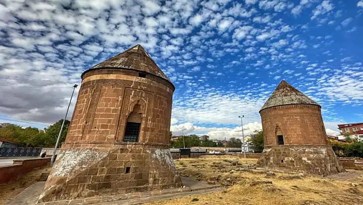 Bitlis'in Ahlat ilçesinde gökyüzünde oluşan yoğun bulut kümeleri, tarihi kümbetlerle birleşince ortaya seyri güzel manzaralar çıktı.