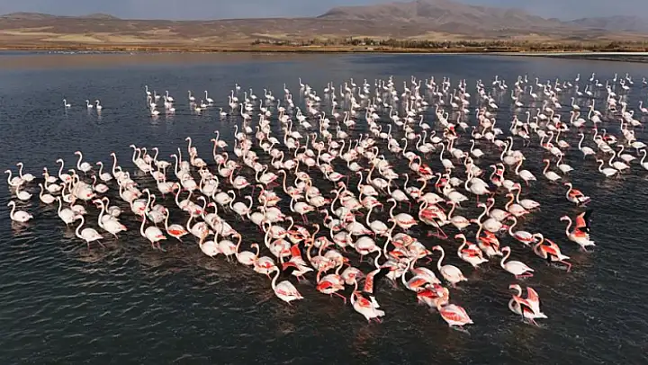 Doğunun saklı cenneti Van'daki Erçek Gölü, zarif misafirleri olan flamingoları ağırlamaya devam ediyor.