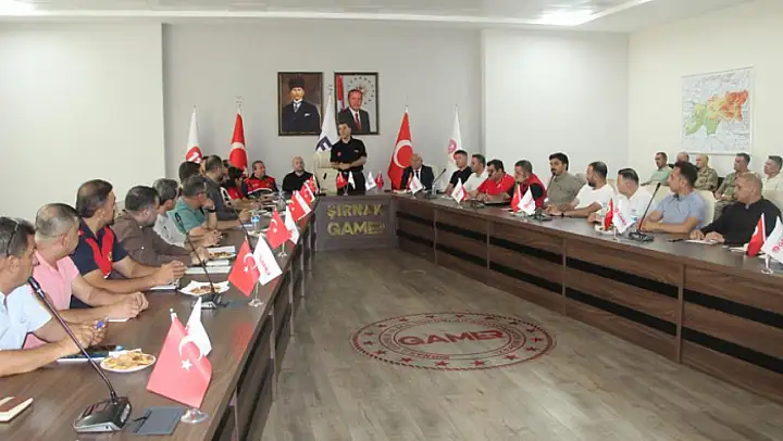 İşlek, 'Toplantıda depremin hazırlıklarını yapmak üzere 23 kurumdan afet ve ana çözüm destek ortaklarımızla birlikte, aynı zamanda 6 ilçe kaymakamlığımızın yazı işleri müdürleri, ilçe jandarma komutanlarıyla birlikte tatbikatın hazırlıklarını görüşmek için bir araya geldik. Deprem ülkesi olmamız hasebiyle son 25 yılda ülkede birçok deprem yaşandı. En yakın tarihte Kahramanmaraş depremi ve dün Balıkesir Sındırgı depremini görebilmekteyiz. Depremi her an yaşayacağımızın bilinciyle kurumlar olarak hazırlıklarımızı en üst seviye getirmemiz bizim birinci önceliğimizdir. 9 Eylül'de AFAD'ın haritalarında Cizre fayı olarak adlandırılan fayın 7 büyüklüğünde bir deprem üretebileceğini öngörerek, bu deprem meydana geldiğinde ilçelerde kaç enkazımızın olacağını, kaç kişinin vefat edeceğini, kaç kişinin barınmaya ihtiyaç duyacağını birtakım AFAD ve kurumlardan aldığımız verilerle analiz ediyoruz. Bu analizler sonucunda bu depremde Cizre ilçesinde 3 bin 200 bina, Silopi'de bin 200 bina, Şırnak merkezde 300 binanın yıkılacağını, aynı zamanda Uludere, Güçlükonak ve İdil ilçelerinin de bundan etkileneceğini hesaplamışız. Toplantımızda bunları öngörerek jandarmamız afattan etkilenen vatandaşların tahliyesini sağlayarak, geçici barınma noktalarına nakillerini sağlayacak. Emniyetimiz trafiği yönlendirecek hem de mücavir alanların güvenliğini sağlayacak. Kızılay afetten etkilenen vatandaşların beslenmelerini sağlayacak. Bu şekilde tüm afet gruplarımız enkaz kaldırma, defin ve kimliklendirmeye kadar tüm gruplarımızın hazır olması için toplantıda görüşüldü. Toplantıda hangi afet grubumuzun nasıl bir pozisyon alacağını birebir konuştuk ve gerçek anlamlı bir tatbikat yapacağımızı ilettik. Bu tatbikata 11 ilden AFAD'ın destek ekipleri intikal edeceklerdir' dedi.