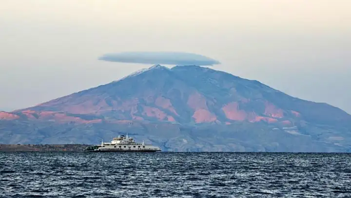 Bitlis'in görkemli simgelerinden biri olan ve 4 bin 58 rakımı ile Türkiye'nin üçüncü yüksek dağı olan Süphan Dağı, doğa tutkunlarını büyüleyen eşsiz bir manzaraya sahne oldu. Akşam saatlerinde dağın zirvesini saran mercek bulutu, Tatvan sahilinden fotoğraflandı. Van Gölü'nün masmavi suları ve üzerinde seyreden feribotla birlikte Süphan Dağı'nın manzarası hayranlık uyandırdı.