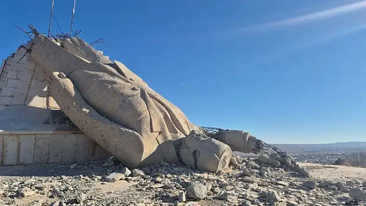 Suriye'de geçtiğimiz yıl Esad rejiminin yıkılmasının ardından Şam'ın yaklaşık 88 kilometre kuzeyinde bulunan ve 'Heykel Tepesi' olarak bilinen noktaya iş makineleriyle çıkan halkın devirdiği Hafız Esad'ın ülkedeki en büyük heykeli hale devrik halde bulunuyor.