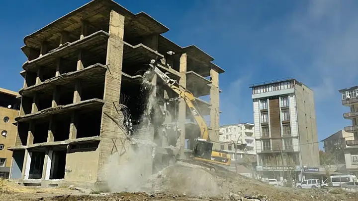 Hakkari'nin Yüksekova ilçesinde 23 yıldır iskelet halinde bekleyen bina, kentsel dönüşüm projesi kapsamında yıkıldı.
