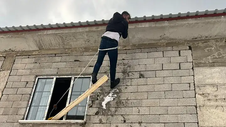 Hakkari'nin Yüksekova ilçesinde temizlik yaptığı çatıda ayağı kayan vatandaş, beline bağladığı ip sayesinde boşlukta asılı kalarak hayata tutundu. Şahıs, itfaiye ekiplerince merdivenli araçla kurtarıldı.