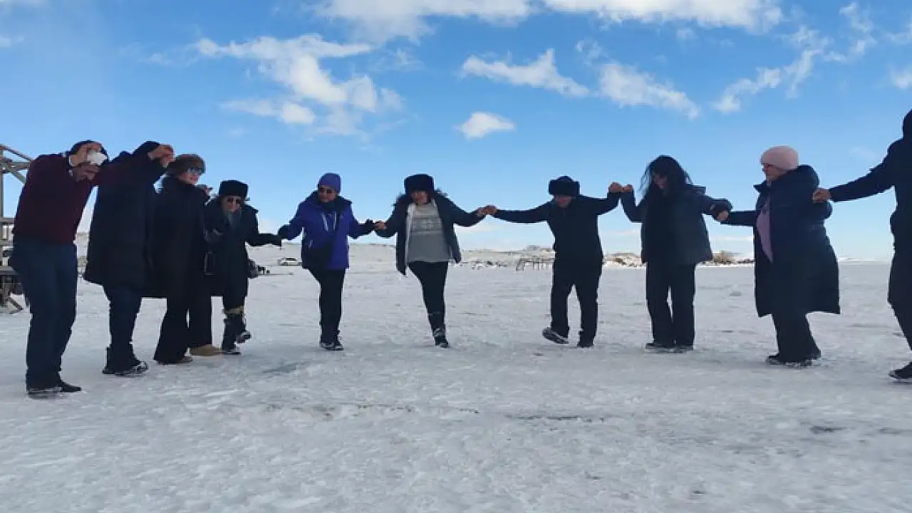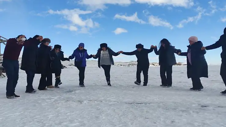 Çıldır Gölü buz tuttu, turistler halayla ısındı