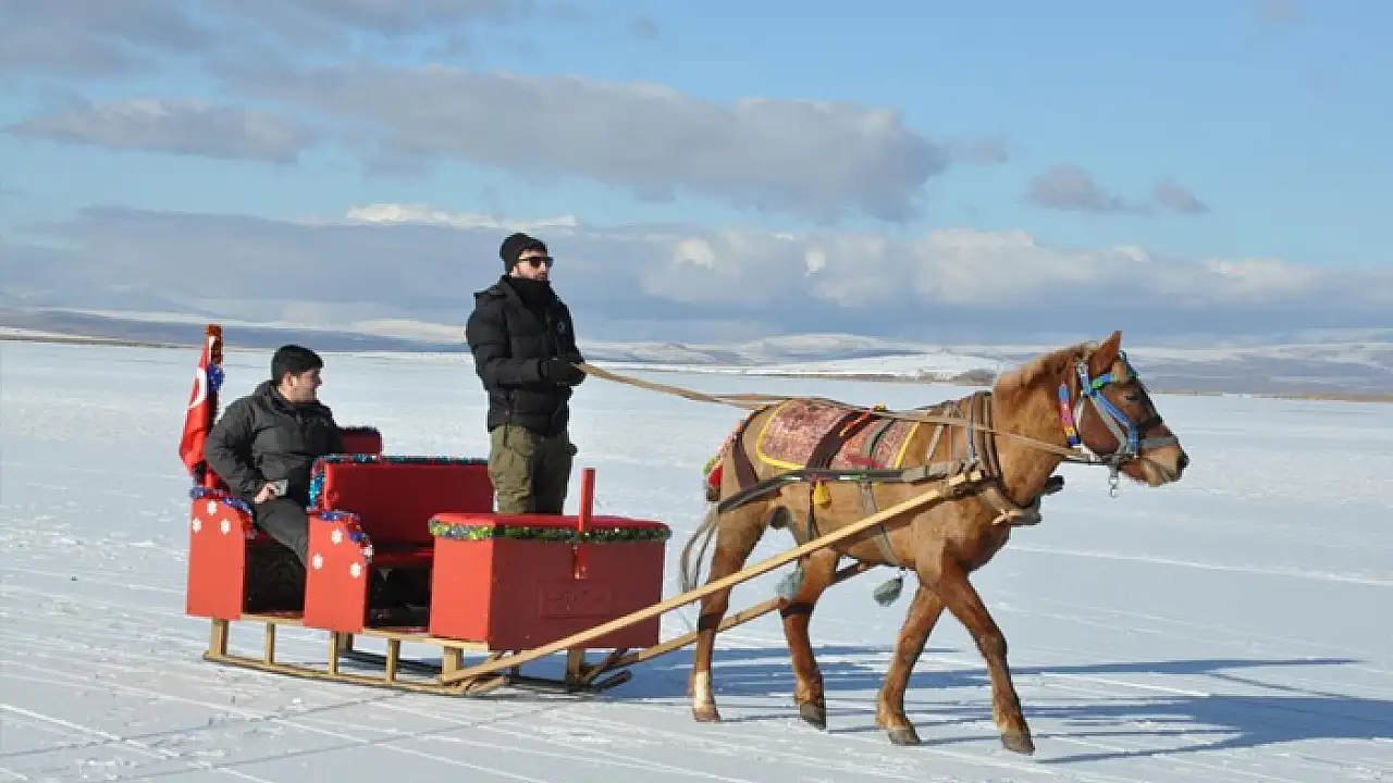 Aslan, "Çıldır gölü buz tuttu. 15-20 santim aralığında buz kalınlığımız var. Atlarımızı çıkardık, atlı kızaklarla gezinti yapıyoruz. Kar motorlarımız, atlı kızaklarımız hepsi gölün üzerinde gelen misafirlerimizi Mart ayına kadar ağırlamaya çalışacağız" diye konuştu.