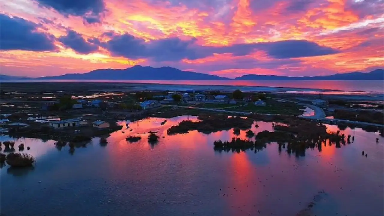 Van’ın doğusunda yer alan Erçek Gölü, gün batımında bir kez daha büyüleyici görüntülere sahne oldu. Doğa fotoğrafçısı Recep Dağ tarafından dronla kaydedilen görüntülerde, güneşin turuncu ve kızıl tonları gölün sakin sularına yansırken ortaya kartpostallık manzaralar çıktı. Günün son ışıklarıyla birlikte göl yüzeyinde oluşan renk cümbüşü, izleyenleri adeta mest etti. Gökyüzünün yavaş yavaş kararmaya başlamasıyla birlikte kuşların siluetleri de görüntülere ayrı bir güzellik kattı.