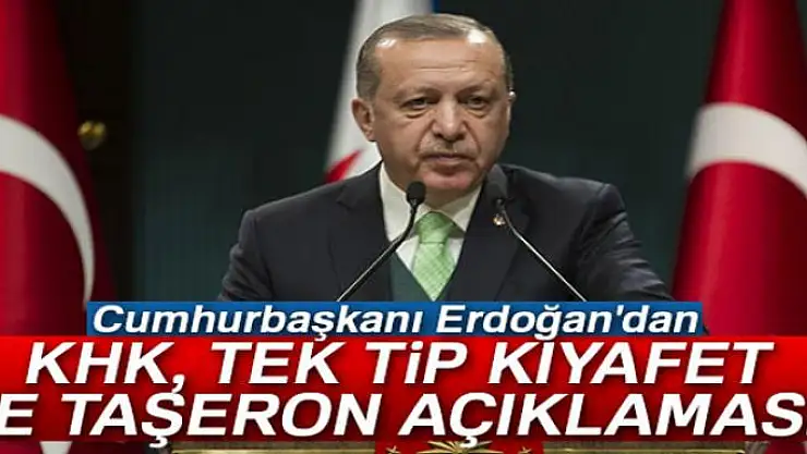 FETÖ mensubu teröristlerin duruşmalara gelirken tek tip kıyafet giymelerine yönelik sorulan soruya cevap veren Erdoğan, "KHK ile ilgili olarak ön önemli diyebileceğim şey tek tip elbise meselesi. Bu konuda Adalet Bakanlığına inisiyatifi verilen, örneğin bayanlarla ilgili, burada çözüm yolları da var. Burada zannediyorum şöyle bir şey anlaşılıyor, cezaevine girdiği andan itibaren tek tip elbise. Öyle bir şey yok. Bu sadece duruşmalara gelirken bu insanlar tek tip elbiselerle gelecek. Öyle kravatlı, çok havalı şekilde duruşmalara gelmeyecekler. Tek tip elbiseyi giyecek öyle duruşmaya gelecekler. Bunların içinde tulum giyecek olanlar var. Bayanların giyim şekli çok daha farklı olarak değerlendirilecek. Bunun çalışmasını Adalet Bakanlığı yapacak. Bu aslında mağdurların ve mazlumların da bir talebidir. Diyorlar ki, ‘Bunlar benim evlatlarımı öldürdü, şehit etti, bu kadar rahat nasıl olur da buraya geliyor, bunlar darbeci, terörist, nasıl geliyorlar.’ Aslında bu sese kulak vermedir, bu sese kulak vermenin bir adımıdır. Şu anda Amerika bunu uyguluyor. Dünyanın değişik yerlerinde bu uygulanıyor. Guantanamo’da tek tip elbiselerle yaşam şekli oluşturulmuştur. Son meşhur duruşmada bırakın tek tip elbise giymeyi ayaklarına zincir vurarak mahkemeye getirmişlerdir. Türkiye böyle bir uygulama yapmıyor. Sadece eline kelepçe vuruyor, duruşma salonuna kadar getiriyor, orada kelepçeyi de alıyorlar” ifadelerini kullandı.