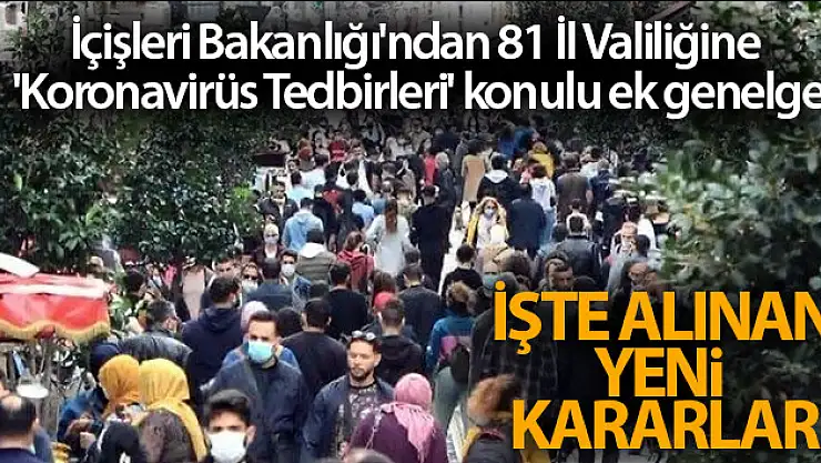 Genelgede, korana virüs salgınının toplum sağlığı ve kamu düzeni açısından oluşturduğu riski yönetme, sosyal izolasyonu temin, fiziki mesafeyi koruma ve hastalığın yayılım hızını kontrol altında tutma amacıyla yeni kararlar hayata geçirildi. Genelde alınan yeni kararları şu şekilde sıralandı:
