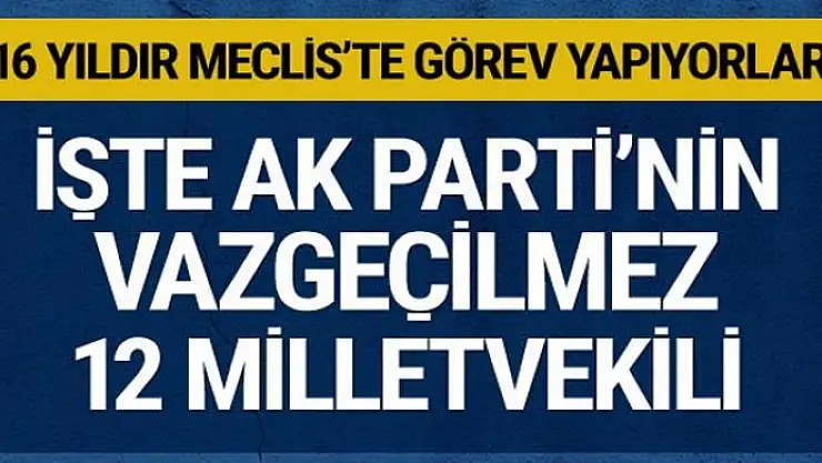 AK Parti'nin vazgeçemediği 12 milletvekili var. AK Parti, kurulduğu 14 Ağustos 2001 tarihinden sonra girdiği ilk seçim olan 3 Kasım 2002 erken genel seçimde yüzde 34.4 oy alarak 365 milletvekilliği kazandı.