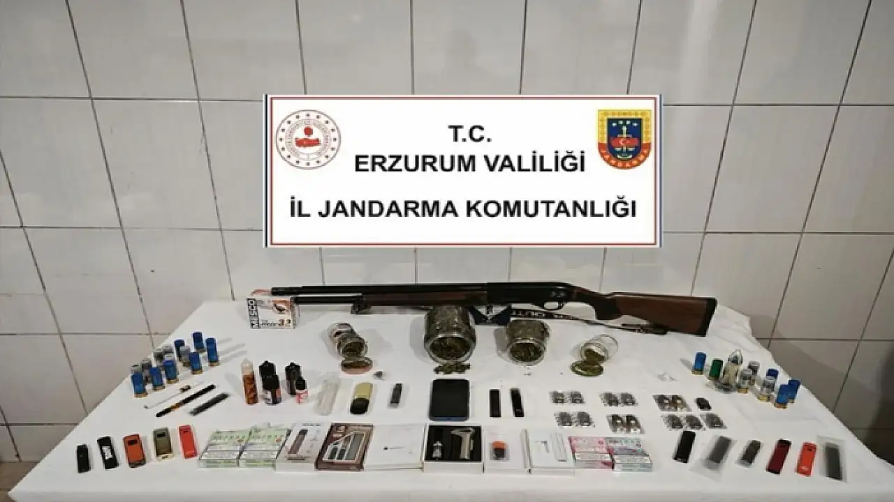 Erzurum Cumhuriyet Başsavcılığı koordinesinde Pazaryolu ilçesinde gerçekleştirilen operasyonda; 167 gram kubar esrar, 8 gram kokain, 1 adet uyuşturucu kullanma aparatı, 12 adet uyuşturucu madde kullanıldığı değerlendirilen boş likit şişesi, 1 adet ruhsatsız av tüfeği, 67 adet 12 cal. av tüfeği fişeği, 29 adet kaçak elektronik sigara cihazı, 19 adet kaçak elektronik sigara cihazı başlığı ve 1 adet suçta kullanıldığı değerlendirilen cep ele geçirildi.