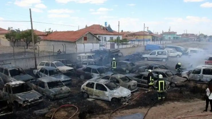 Konyada trafik otoparkında çıkan yangında yaklaşık 70 araç kül oldu.