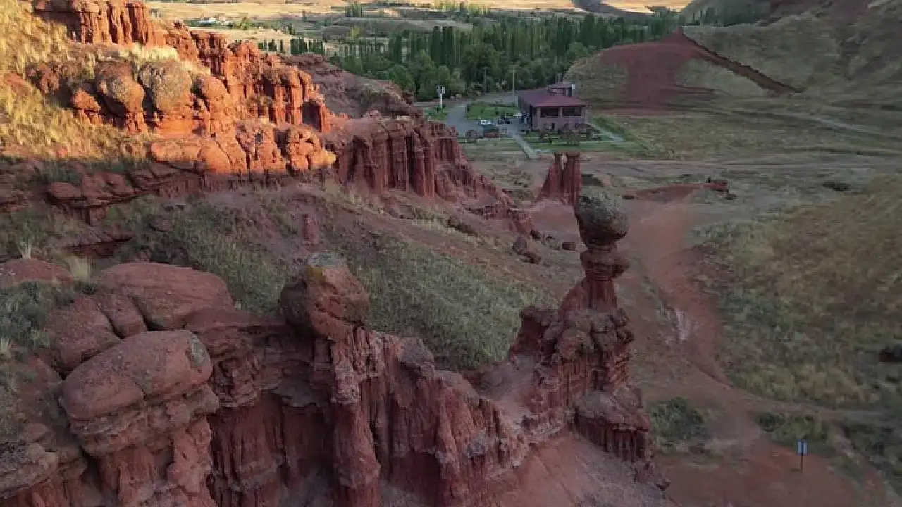 Kırmızı renkli tüf kayalarının rüzgâr ve yağmur etkisiyle şekillenmesi sonucu ortaya çıkan bu doğal güzellikler, Kapadokya'daki peri bacalarına benzerliğiyle dikkat çekiyor.