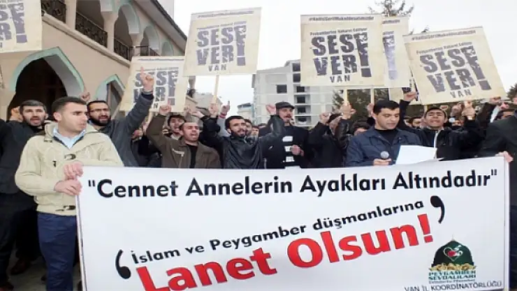 Cuma namazı sonrası Hz. Ömer Camii önünde bir araya gelen Peygamber Sevdalıları Van İl Koordinatörlüğü üyeleri adına Tuncer Şakar bir açıklama yaptı. Şakar, “Bu melun zihniyet Hz. Peygamberimizin hadis-i şerifi olan ‘cennet annelerin ayakları altındadır’ sözünü edepsizce sayfalarında yer verdiği bir karikatüre malzeme etmeye çalışmıştır. Yine hatırlanacağı üzere bu zihniyet, Silopi ve Diyarbakır gibi bazı yerlerde çarşaflı kadınları zincirleyip tesettüre hakaret etmişti. İlimizin İpekyolu Belediyesi de ‘Biz kadınız, biz emanet değiliz’ pankartını asarak Hz. Muhammed’in ‘Kadınlar size Allah’ın emanetidir’ hadisini hedef almıştı. Bu kabul edilemez durumu kınadığımızı açıklamakla birlikte şunu belirtmek isteriz ki; son zamanlarda toplumsal ciddi tepkiler ortaya çıkarmasına rağmen ‘kadın hakkı’ adı altında dini değerlere düzenli bir şekilde saldırıldığını görmekteyiz” dedi.