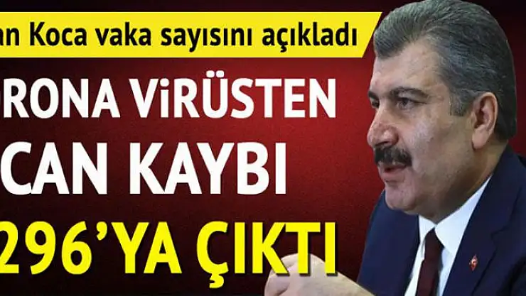 Sağlık Bakanı Fahrettin Koca, corona virüsü ile ilgili son dakika gelişmelerini ve Türkiye Günlük Koronavirüs Tablosu'nu Twitter'dan paylaştı. Tabloya göre, nedeniyle hayatını kaybedenlerin sayısı bin 296'ya yükseldi. Bakan Koca, "Test sayımız yakında 500 bine ulaşacak. Artan test sayısına kıyasla beklenen vaka sayısındaki artış, hız olarak azalmaktadır. Erken tanı ve tedavi, iyileşen hasta sayımızı artırıyor" dedi.