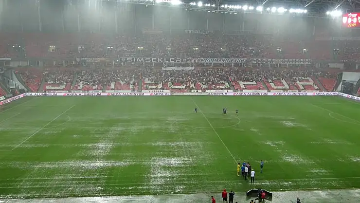 Eline topu alan hakem Şeker, birkaç farklı noktada topun sekip sekmediğini denedi. Hakem ve futbolcular sahanın temizlenmesi için kısa süreliğini soyunma odasına gittiler. Yağmur etkisini azaltmayınca tekrar yardımcılarıyla birlikte sahaya giren hakem Burak Şeker, birkaç denemeden sonra da top sekmeyince her 2 takımın kaptanları ve teknik direktörlerini yanına çağırarak karşılaşmanın ertelendiğini bildirdi.