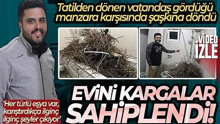 Tatil için 15 gün evinden ayrılan Levent Yıldız, eve gelince gördüğü manzara karşısında şaşkına döndü. Camdan içeri giren kargalar, evin banyo kısmını çöp ve dallarla doldurdu.