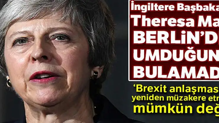 Brexit krizine çözüm bulmak için Merkel'le bir araya gelen May, Berlin'den umduğunu bulamadı. Alman medyası Federal Başbakanlık kaynaklarına dayandırdığı haberlerde görüşmeden May'in eli boş döndüğünü paylaştı. Görüşmenin ardından yapılan açıklamada Almanya Başbakanı Merkel'in May'e, "Brexit anlaşmasını yeniden müzakere etmek mümkün değil" ifadelerini söylediği belirtildi.