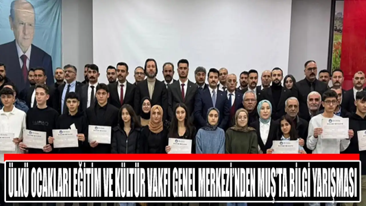 Ülkü Ocakları Eğitim ve Kültür Vakfı Genel Merkezi'nden Muş'ta Bilgi Yarışması Ülkü Ocakları Eğitim ve Kültür Vakfı Genel Merkezi tarafından Muş'ta düzenlenen Ortaöğretim Teşkilatları Arası Bilgi Yarışması, yoğun katılım ve coşkulu bir atmosferde gerçekleştirildi.