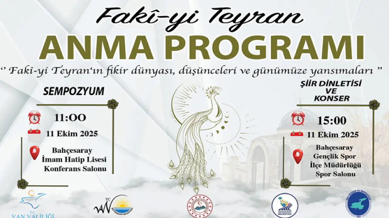 Van Büyükşehir Belediyesi, ünlü şair ve düşünür Fakî-yi Teyran'ı anmak amacıyla özel bir program düzenliyor. 11 Ekim 2025 Cumartesi günü gerçekleştirilecek olan etkinlik, Fakî-yî Teyran'ın düşünce dünyasını ve günümüze etkilerini konu alacak.