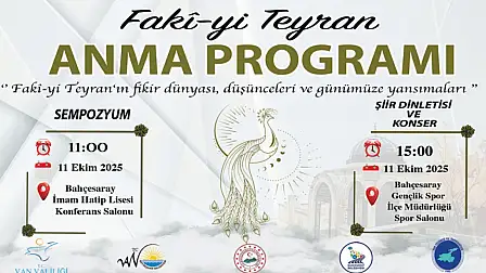 Van Büyükşehir Belediyesi, ünlü şair ve düşünür Fakî-yi Teyran'ı anmak amacıyla özel bir program düzenliyor. 11 Ekim 2025 Cumartesi günü gerçekleştirilecek olan etkinlik, Fakî-yî Teyran'ın düşünce dünyasını ve günümüze etkilerini konu alacak.