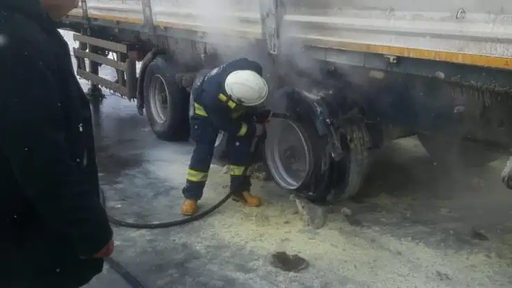 Van-Erciş kara yolunda seyir halindeki tırın yanan lastikleri itfaiye ekipleri tarafından söndürüldü.