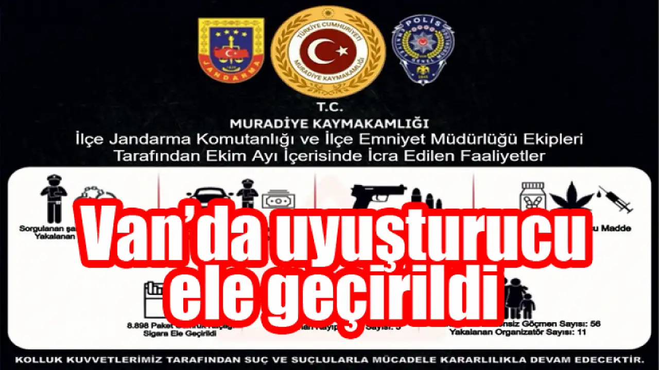 Muradiye Kaymakamlığından yapılan açıklamada, İlçe Jandarma Komutanlığı ve İlçe Emniyet Müdürlüğü ekiplerince ekim ayı içerisinde gerçekleştirilen çalışmalar sonucunda 101 bin 65 şahsın sorgusunun yapıldığı ve 5 kişinin yakalandığı belirtildi. Açıklamada, "Ekipler 7 bin 984 aracı kontrol etti, 214 araca cezai işlem uyguladı. Gerçekleştirilen operasyonlarda 3 adet ruhsatsız silah, 2 kilogram uyuşturucu madde ve 8 bin 898 paket gümrük kaçağı sigara ele geçirildi. Kayıp olarak aranan 3 şahıs bulunurken, 56 düzensiz göçmen ve 11 organizatör yakalandı. Kolluk kuvvetlerinin ilçe genelinde huzur ve güven ortamını sağlamak için yürüttüğü faaliyetlerin kararlılıkla devam edeceği belirtildi" denildi.