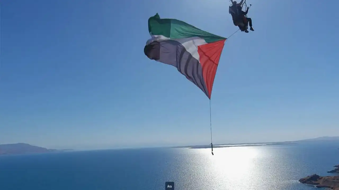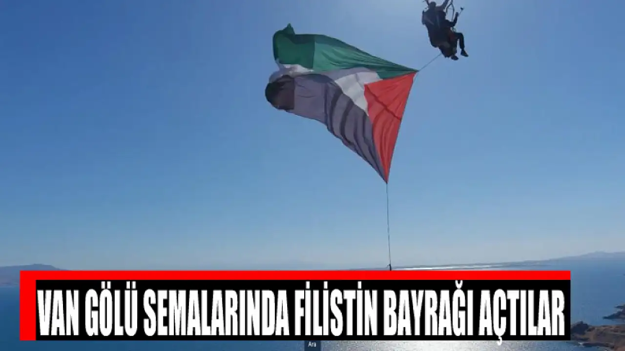 Antalyalı Yamaç Paraşütü Pilotu Mehmet Sadık Göller, takım arkadaşıyla birlikte Van Gölü semalarında Filistin bayrağı açtı.