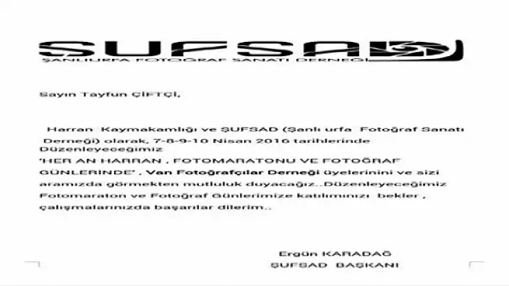Harran Kaymakamlığı ve Şanlıurfa Fotoğraf Sanatı Deneği (ŞUFSAD) tarafından nisan ayında yapılacak olan Harran tanıtım günlerine katılma daveti aldıklarını belirten VANFOD Yönetim Kurulu Başkanı Tayfun Çiftçi, “7-10 Nisan tarihlerinde düzenlenecek olan ‘Her an Harran’ fotoğraf maratonuna resmi davet alan VANFOD, Van’ı temsilen yer alacak. Van’ı anlatan fotoğrafların yer alacağı tanıtım filmimiz gösterilecek. Bunun yanında VANFOD yönetim kurulu üyelerinden Aynur Aytin, Emrullah Keleş, Roni Rıdvan Süslü ve Mehmet Şah Deniz’in fotoğraflarının yer alacağı ‘Anadolu’yum ben’ adlı sergimiz de açılacaktır. Amacımız, ilimizi her yerde en güzel şekilde tanıtmaktır” dedi.