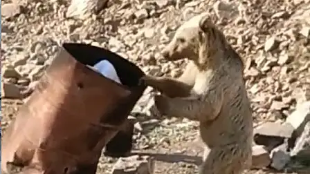 Hakkari'nin Çukurca ilçesinde bir ayı, yiyecek bulmak için çöp kovasını devirirken görüntülendi.
